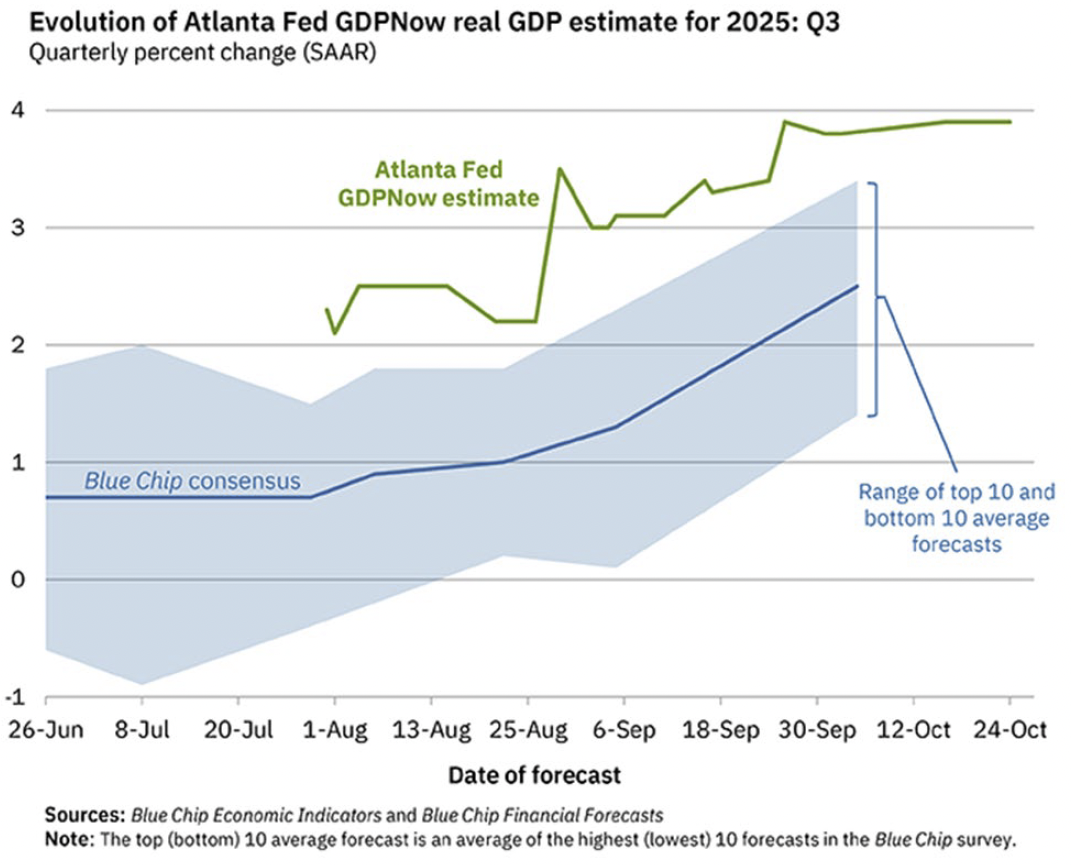 Ghost in the machine. We should not ignore the resoundingly strong fundamentals that continue to underpin today’s capital markets. For all of the thinking about the inevitability of recession over the last few years, the U.S. economy continues to motor. As shown in the chart below, “Blue Chip” economists forecasts (blue line below) are now scrambling to catch up to the reality that the data (green line) has been implying for months now. Expect more of the same as we continue through 2025 Q4 to the end of the year.