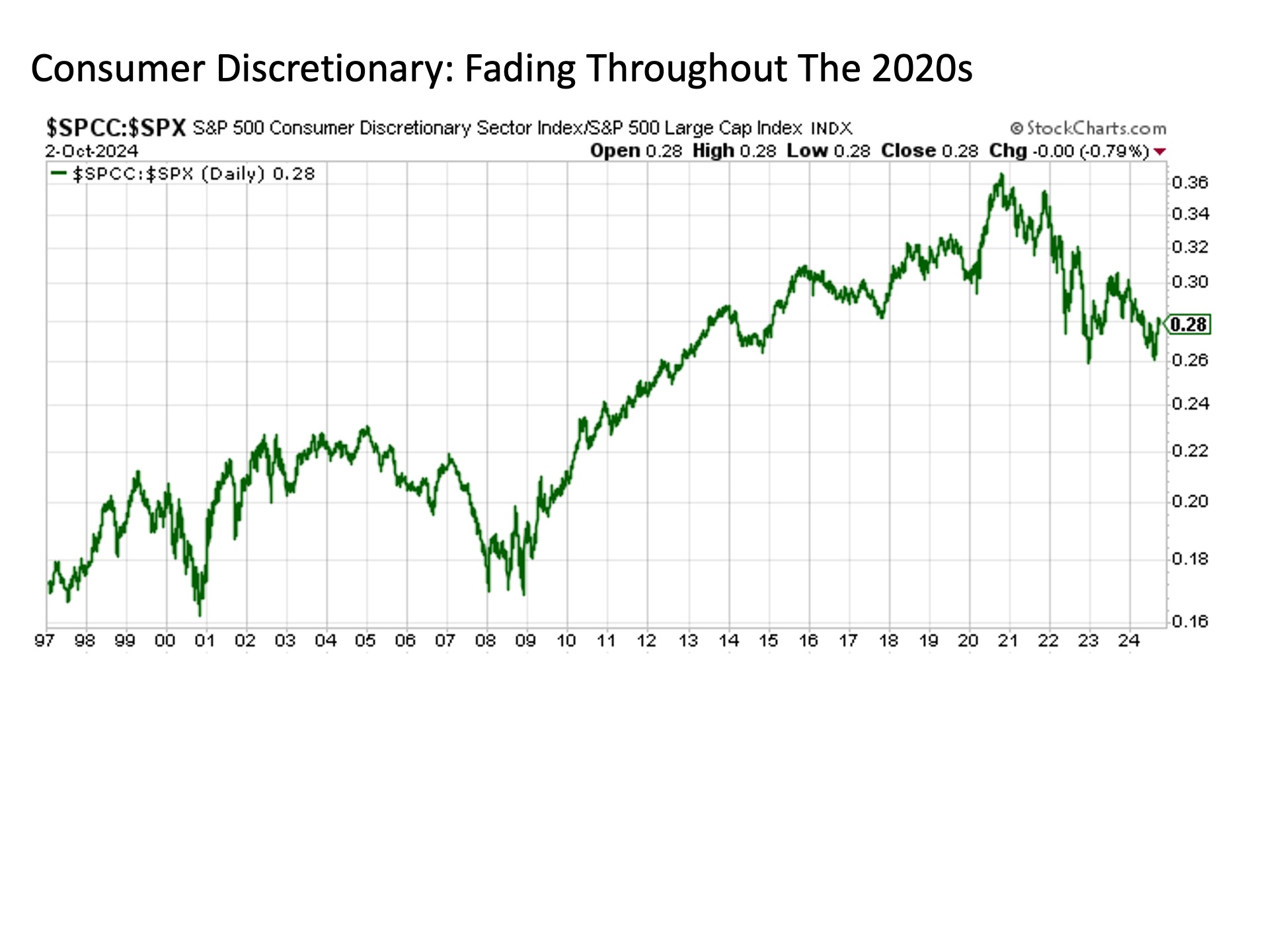 The consumer discretionary sector may be foreshadowing the turn that could eventually befall the overdue tech sector. Since 2021, the consumer discretionary sector has descended into a relative decline versus the broader U.S. stock market.