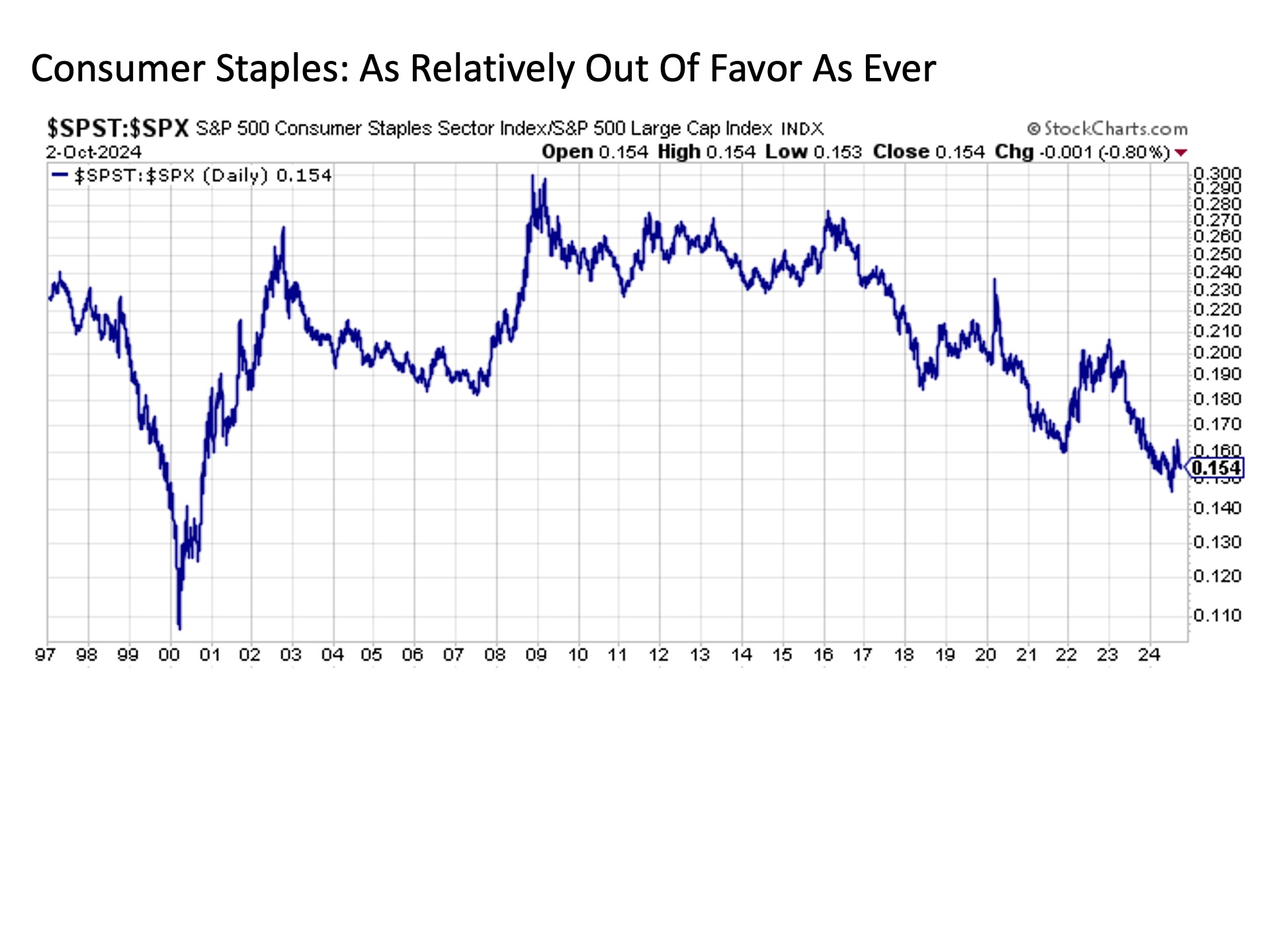 Consider the consumer staples sector, which historically has thrived during periods of economic uncertainty while also providing a measure of inflation protection through the wide economic moats and pricing power that many of these companies boast.  Today, consumer staples stocks are trading at their largest relative performance discounts in nearly 25 years, thus suggesting potential long-term opportunities.