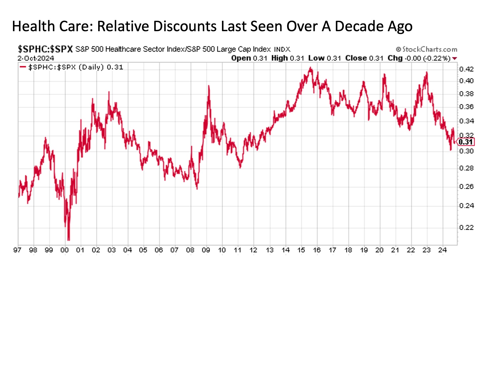 A similar vein holds health care stocks.  While they are not trading at the relative lows of its defensive consumer staples brethren, health care stocks have faded in the aftermath of the global pandemic to levels relative to the market last seen more than a decade ago.