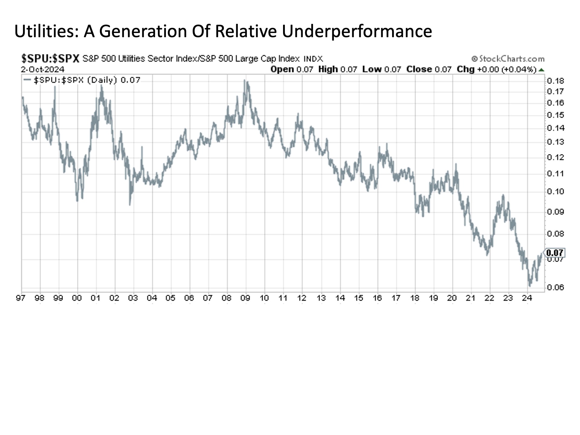 Investing is a long-term game.  And when evaluating long-term portfolio opportunities, it is worthwhile to consider the relative performance of various segments relative to the broader market.  For over long-term periods of time, market gravity has an uncanny way of dragging relative outperformers back to earth and lifting relative underperformers to eventual new heights.  Thus, seeking out those segments that have chronically underperformed for an extended period can bring rewards over time for those investors with a long-term focus.