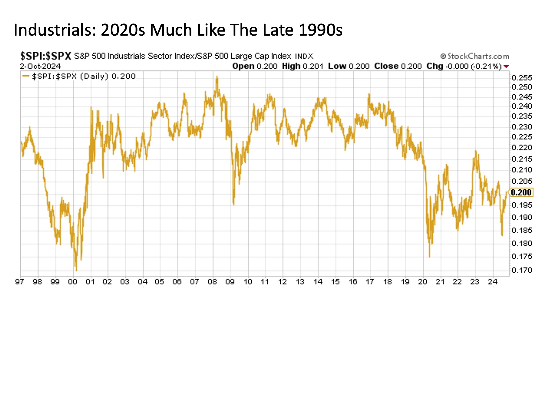 Defensive sectors are not the only ones trading at notable relative lows versus the broader market.  Consider economically sensitive industrials, which have been trading at lows relative to the broader market for the last few years now that were last seen during the dot.com bubble a quarter of a century ago.