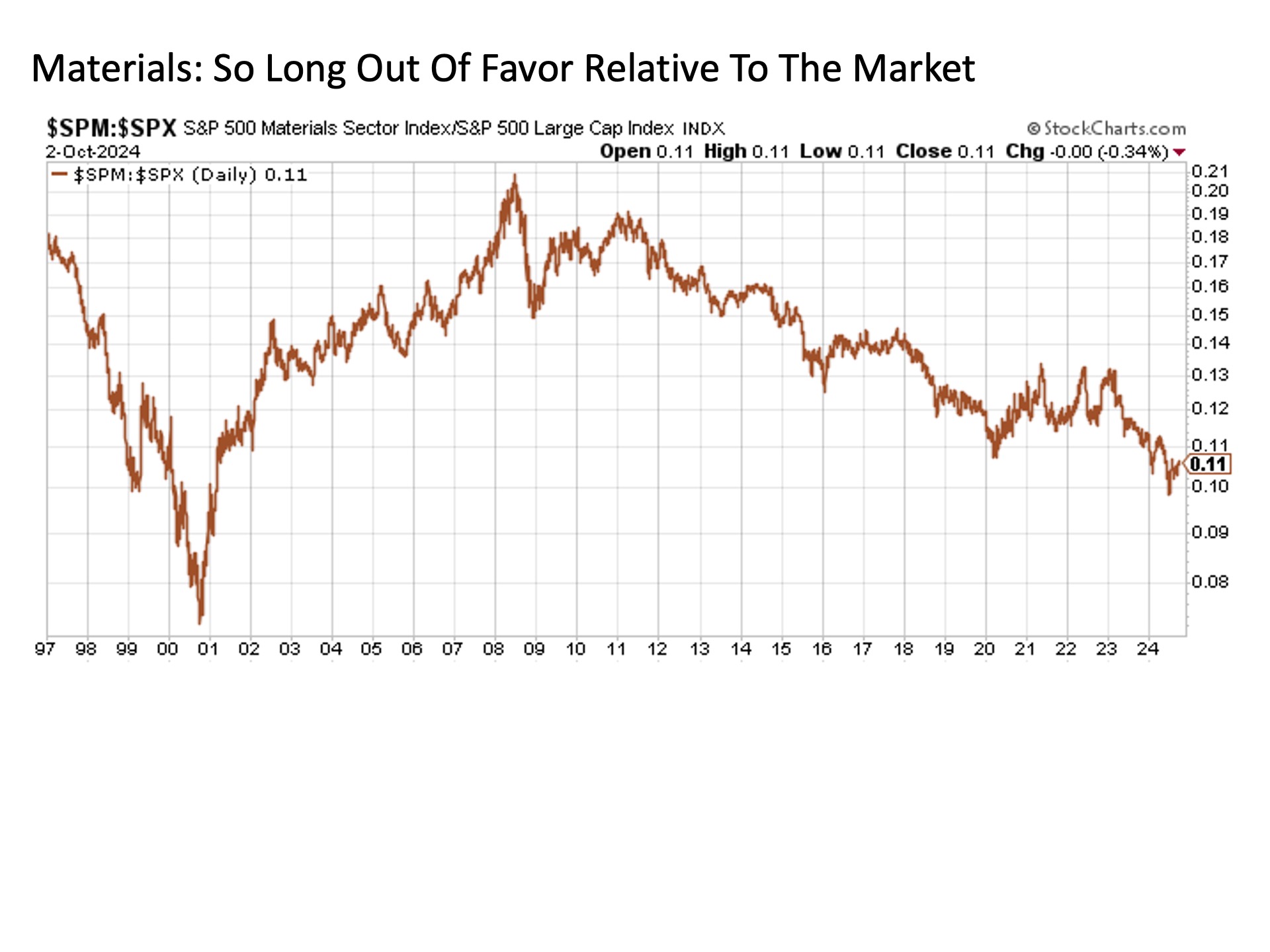 Then there is even more economically sensitive materials stocks, which have faded back toward dot.com era lows on a relative to the broader market basis ever since China got out of the commodities hoarding game not long after the calming of the Great Financial Crisis.