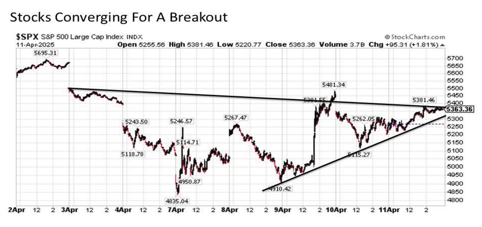 Looking closer at the intraday charts on the S&P 500 provides further support for the short-term upside breakout thesis. Focusing on the intraday trading channel dating back to April 8 in particular (before the 90-day pause was announced), we see that stocks have been picking up momentum with notably higher lows versus only the marginal lower highs dating all the way back to April 3. This implies that buyers are advancing far more assertively in recent trading days since sellers are likely to seek to defend in the coming trading days. And with futures already trading solidly higher heading into the overnight into Monday’s trading, an intraday breakout appears in the cards and is a bullish way to kick off the new trading week.
