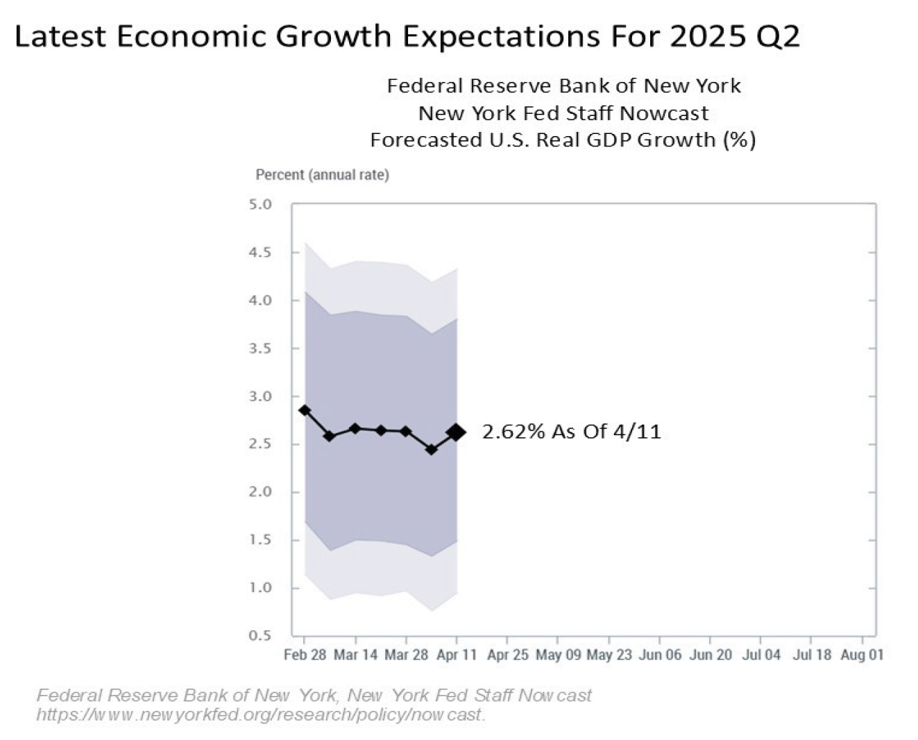 Let’s begin with the latest look at the economic forecasts. For this, we will focus on the latest readings for U.S. GDP growth for 2025 Q2 from the New York Fed Nowcast, which will be the quarter that will start to incorporate the full brunt of the tariffs as they are implemented. While it remains early in the data cycle, the latest forecast for GDP growth for the current quarter is 2.6% as of Friday, April 11. While this number could still change quite a bit over the coming months, this latest reading remains rock solid.