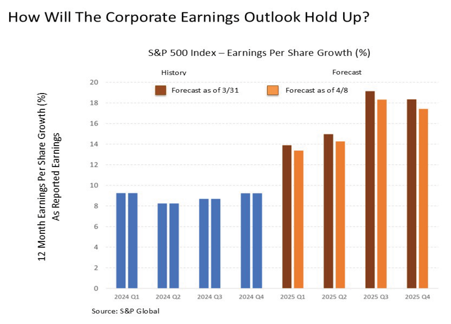 What about the latest on corporate earnings, which are driven by GDP growth and are a primary determinant of stock market returns? The latest forecast is in through April 8 with the first few companies having reported their earnings and their outlook. We have already seen some deterioration in the earnings forecast for the remainder of 2025, which is expected, but nonetheless the earnings forecast remains robust. How much of this collective expected earnings growth the S&P 500 will be able to sustain in the coming weeks remains to be seen, but the good news remains that we are starting from a high bar.