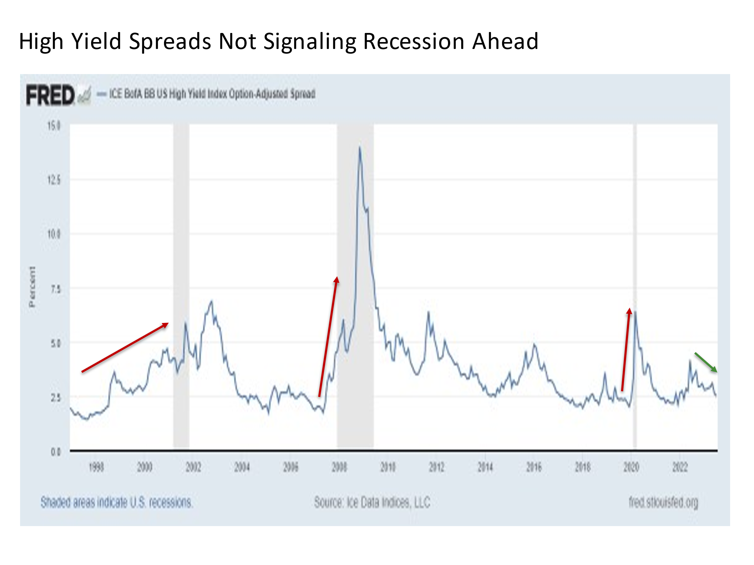 Where do we stand today? High yield spreads have been steadily declining from their 4.17% June 2022 cycle peak to 2.52% today. This represents a spread tightening of 165 bps, which is in stark contrast to the sharp widening seen prior to the bursting of the tech bubble, the onset of the Great Financial Crisis, or the outbreak of COVID. This is a positive signal against the notion of any looming economic recession or bear market.