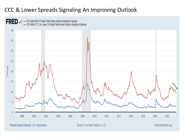 What are CCC-rated and lower bonds signaling today? Not only are we not seeing any signs of stress in the form of widening spreads from this area of the bond market, instead we are seeing a marked narrowing of spreads that is even more pronounced versus what we are seeing across the broader high yield space. Since peaking at 12.81% in September 2022, CCC-rated and lower bond spreads have tightened by 368 bps to 9.13%.