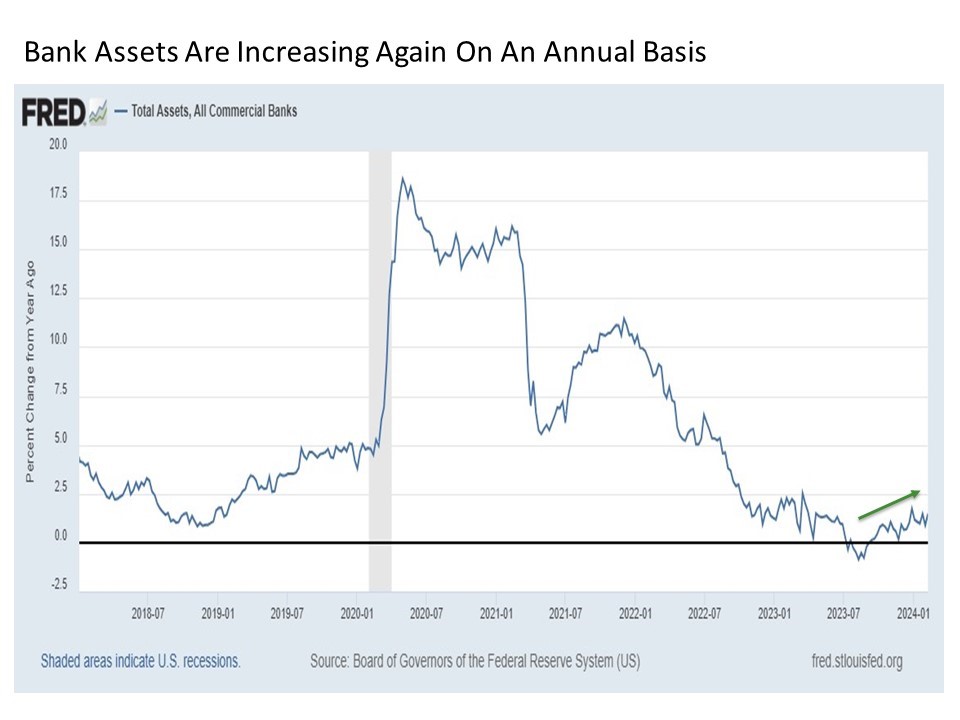 Where do we stand today with total bank asset growth? Over the last few years since the onset of COVID, the growth of bank assets had been steadily decelerating on an annual basis. This included 2022 and into 2023, when the growth of total bank assets eventually turned negative by the middle of last year. But since that time, bank asset growth has steadily and gradually increased. This provides added confirmation to recent data also suggesting that a shrinking percentage of banks are tightening lending standards, which suggests the flow of liquidity through the banking system is gradually becoming more supportive.
