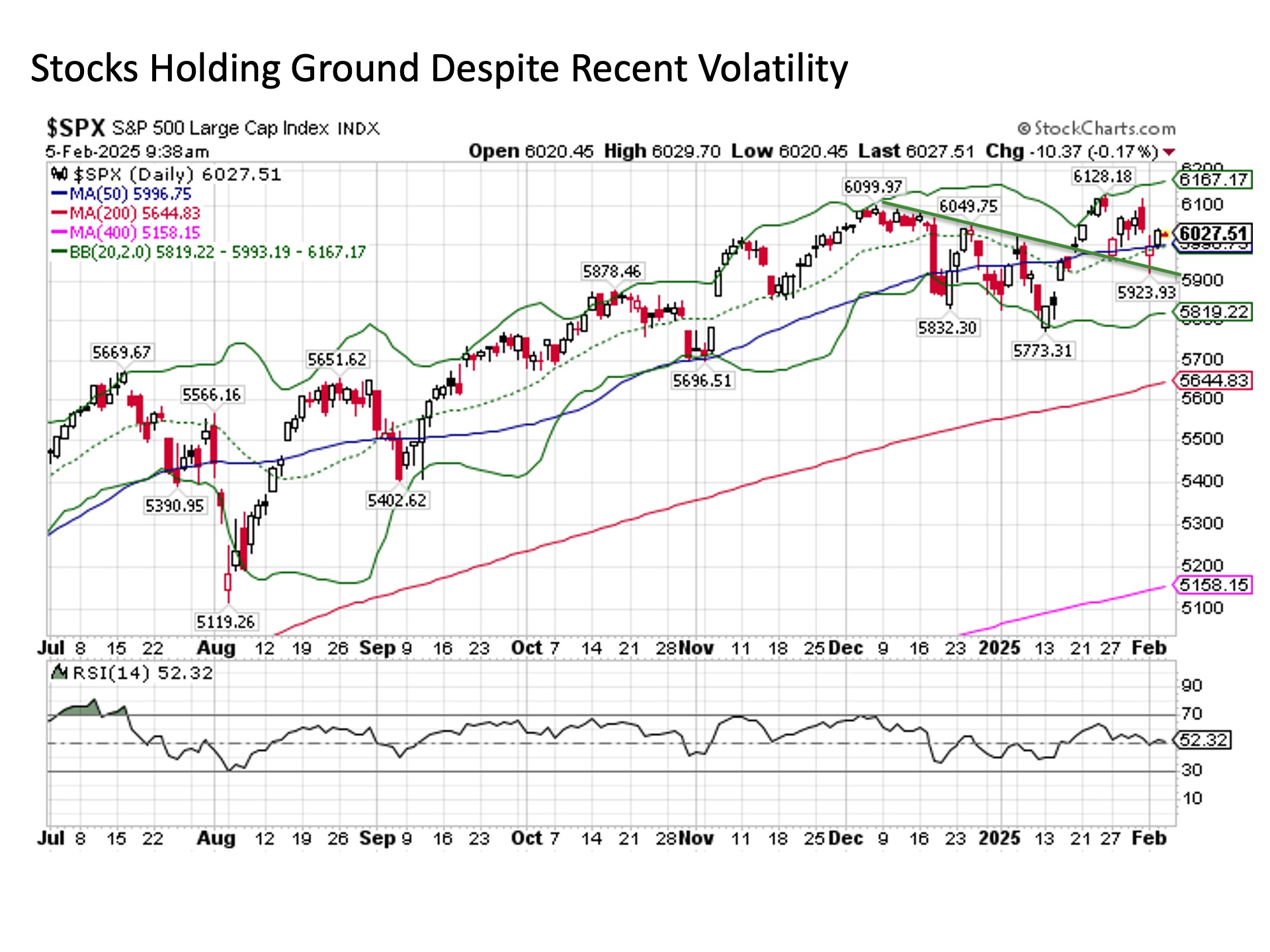 Market check. The U.S. stock market is a capriciously emotional beast. For example, a start up AI company in China effectively drops a Chat GPT knock off app in the Apple Store, and suddenly the largest company in the world by market cap and friends are shedding one-fifth of their value. Fickle and unpredictable to say the least. But in the current and foreseeable market environment, assessing the magnitude and sustainability of such emotional stock market swings can be useful in determining whether the financial media fuss is real or mostly bluster. And when it comes to the headline deluging new administration in Washington, the stock market is on net exuding a collective shrug at least so far amid the steady and sometimes shocking news flow.
