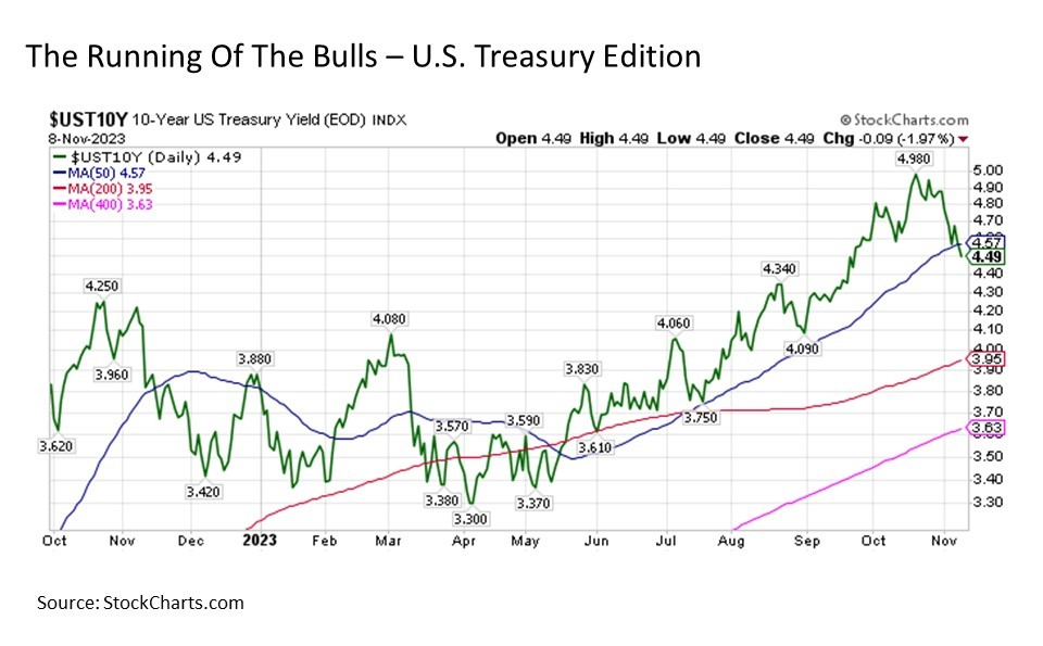 Bonds were long overdue to rally even more so than stocks. This has been particularly true for Treasuries in recent months given the fact that inflation is the primary determinant of U.S. government bond returns and both the headline and core inflation rates continue to steadily fall from their 2022 highs. Thus, the fact that the 10-Year U.S. Treasury yield was pushing as high as 5% as recently as two weeks ago had the benchmark yield running waaaaaay above its medium-term, long-term, and ultra long-term moving averages. For those “regression to the mean” fans out there, the bond market rally slingshot was pulled way back.