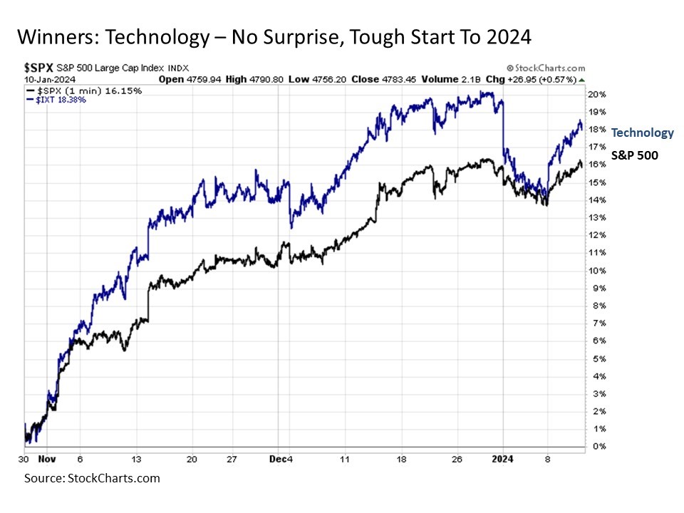 Of course, it should come as no surprise upon closer reflection that financials and real estate have led to the upside in the latest market rally. Investors have staked their bets during this surge that the U.S. Federal Reserve is not only done for the current cycle raising interest rates (this Chief Market Strategist agrees) but that the Fed may cut interest rates by a quarter point as many as seven times in 2024 (this Chief Market Strategist has a decidedly different view). Given that financials and real estate are highly interest rate sensitive sectors, they stand to benefit most from this bold optimism. Indeed, they also stand to feel more pronounced disappointment if these monetary policy expectations fall short in the months ahead.