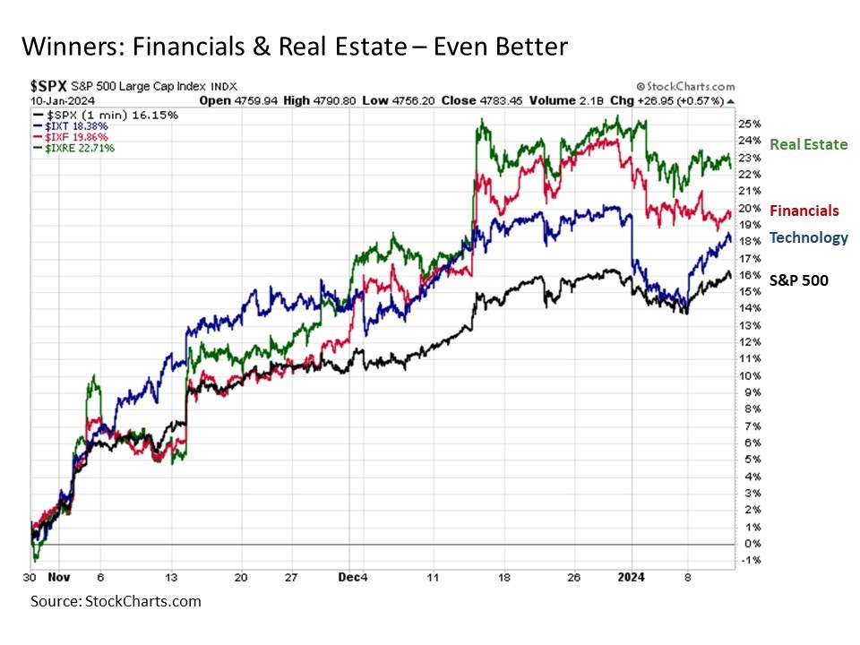 Winning-er. While stocks in general and technology in particular typically dominate all of the financial news headlines, it is worth noting that two other major sectors have performed even better during the most recent market rally since late October. These are financials and real estate.