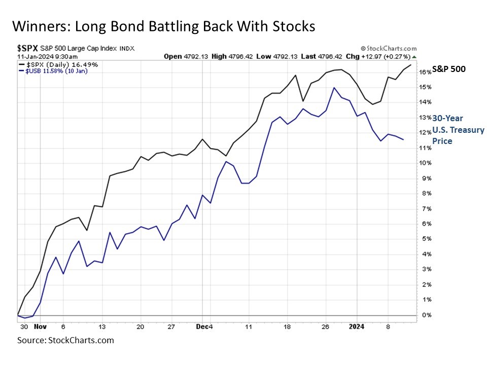 Bond, Long Bond. Speaking of interest rate sensitive investments, the bond market has also seen recent euphoria in part associated with the steady decline in inflation pressures coupled with expectations of easier monetary policy from the Fed in the year ahead. And knowing that the longer the duration of a bond, the more it trades like a stock, we see that the price on the 30-Year U.S. Treasury Bond has rallied almost as strongly as the S&P 500 since the late October rally got underway. This highlights the total return benefits that can come to your portfolio not only within the stock market but also across the asset allocation spectrum.