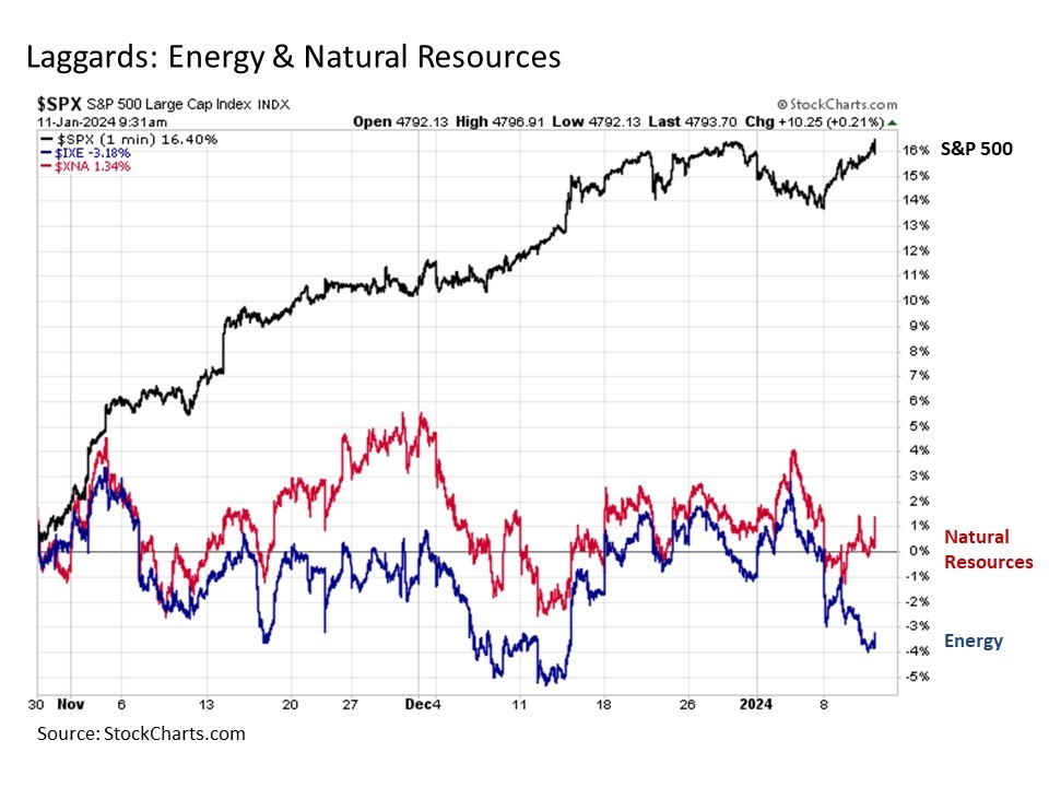For considerations like these, it is worthwhile to sift through the rubble and identify those areas of the market that have been left behind during the most recent market rally. Leading among these is the natural resources segment generally and the energy sector in particular. Not only are natural resources barely positive, but energy stocks are down by more than -3% at a time when the S&P 500 has rallied more than +16%.