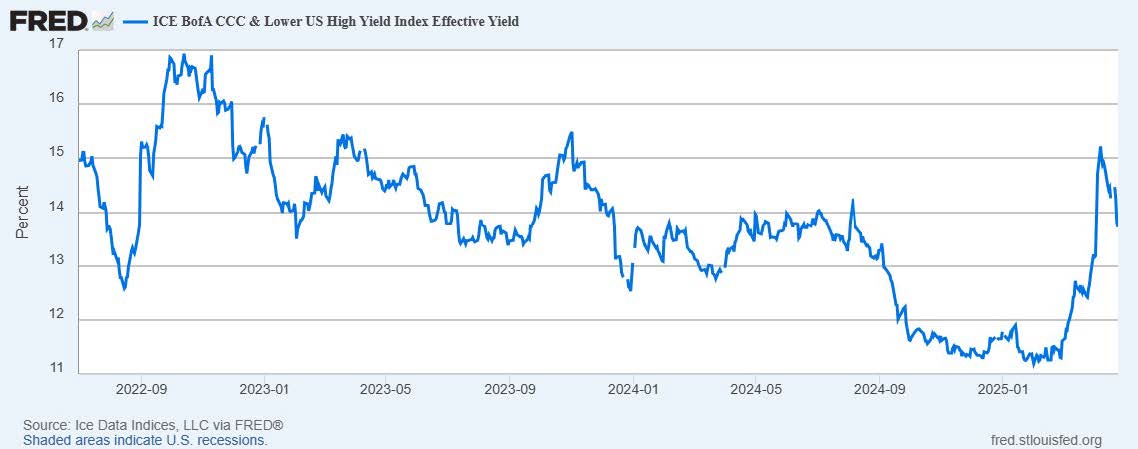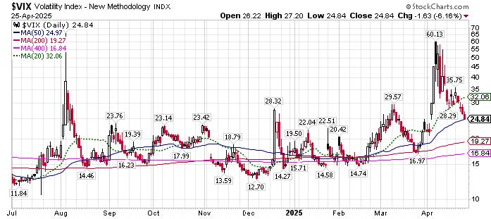 The VIX: The CBOE Volatility Index, or “fear” gauge, spiked over 60 in the days immediately following Liberation Day, which is another way of saying that investors were freaking out a few weeks ago. But in the trading days since, the VIX has steadily descended back lower. This includes a steady decline over the past four trading days to below 25 for the first time since the start of the month. If the VIX continues to fall into the low 20s or even better the high teens, this suggests an S&P 500 driving to reclaim some of those previous support lines (50-day and 200-day MAs) mentioned above, or put more simply the bounce is on like Donkey Kong.
