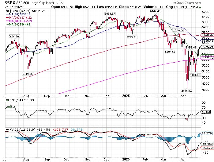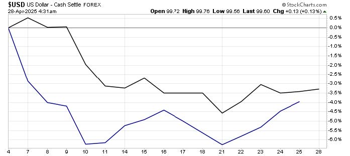 Bonds and the U.S. Dollar: A building concern in the days following Liberation Day was the sharp spike in Treasury yields (reflected in the sharp drop in bond prices as shown by the blue line from April 4 to April 10 in the chart below) coupled with the sharp decline in the U.S. dollar that remained adrift along with thrashing U.S. Treasury yields through last Monday April 21 when the leader of U.S. fiscal policy was stalking the leader of U.S. monetary policy (bad look). This toxic combo was suggesting that foreign investors were selling their loans to the U.S. government and picking up their proverbial marbles to leave the U.S. and go back to their home countries. But since last Monday, we’ve seen U.S. Treasury yields falling (Treasury prices rallying strongly) at the same time that the U.S. dollar is clawing its way back. Capital flight, interrupted, at least for now.