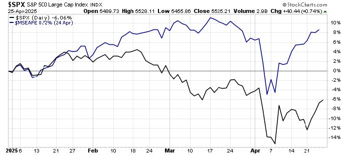 But what about the notion that investors are left feeling inexorably burned by the recent tariff fiasco and may place a more permanent ban on U.S. investment in favor of overseas markets. Undoubtedly, an attractive relative value opportunity exists outside of the U.S., so perhaps this long anticipated geographic rotation may continue to get its day as it has for the year-to-date so far.