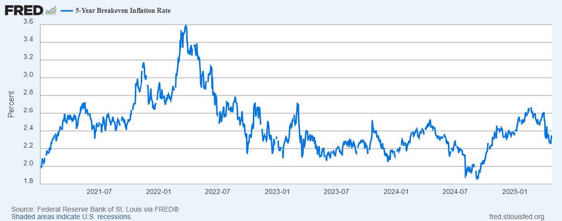 First, inflation expectations remain fully in check despite the recent market bounce. The 5-Year Breakeven Inflation Rate, which measures average expected inflation for the next five years, remains subdued at 2.32%. While this may be signaling greater concerns about a disinflationary economic recession looming in the second half of 2025, I counter this notion with corporate earnings and guidance that are still telling a decidedly different and far more optimistic story through the rest of 2025 and into 2026 so far this earnings season.